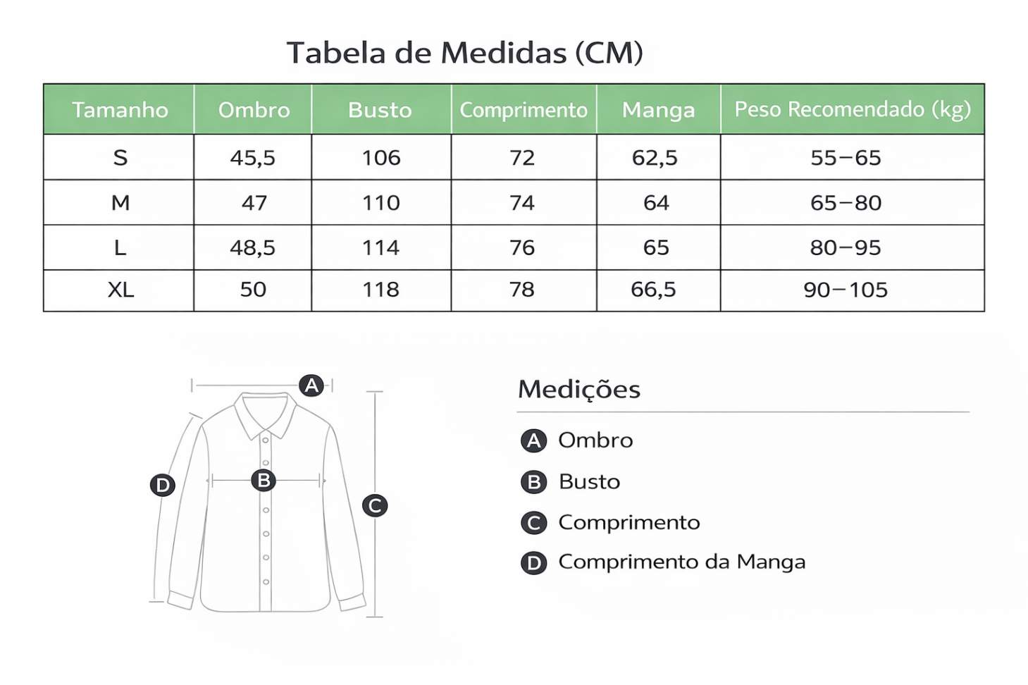 Caro cliente, para ter a para certeza de obter o tamanho mais adequado, dê uma olhada em nossa tabela de tamanhos antes de comprar. Muito obrigado!