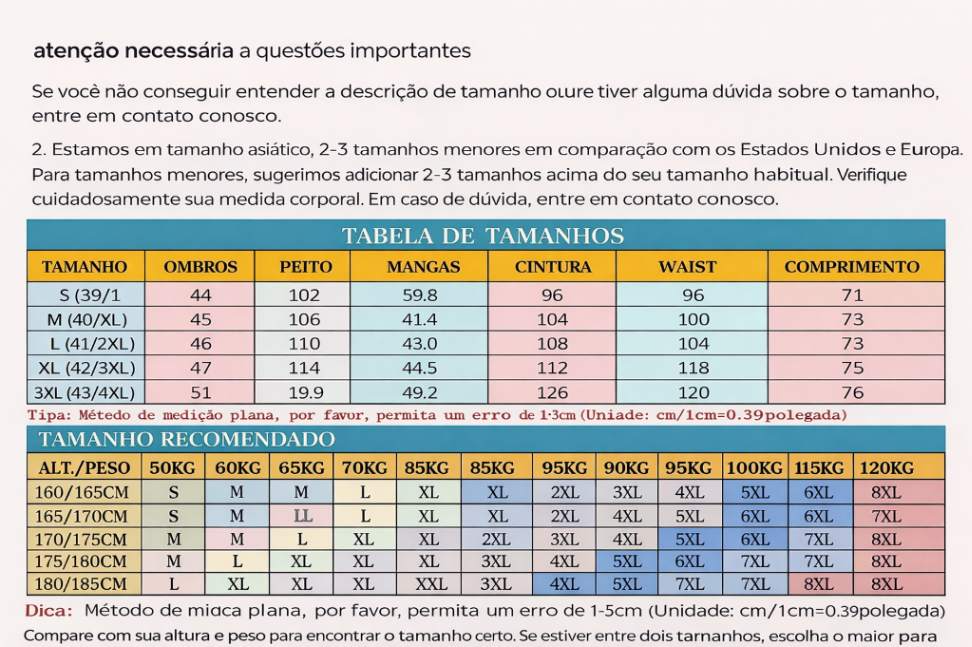 Caro cliente, para ter a para certeza de obter o tamanho mais adequado, dê uma olhada em nossa tabela de tamanhos antes de comprar. Muito obrigado!
